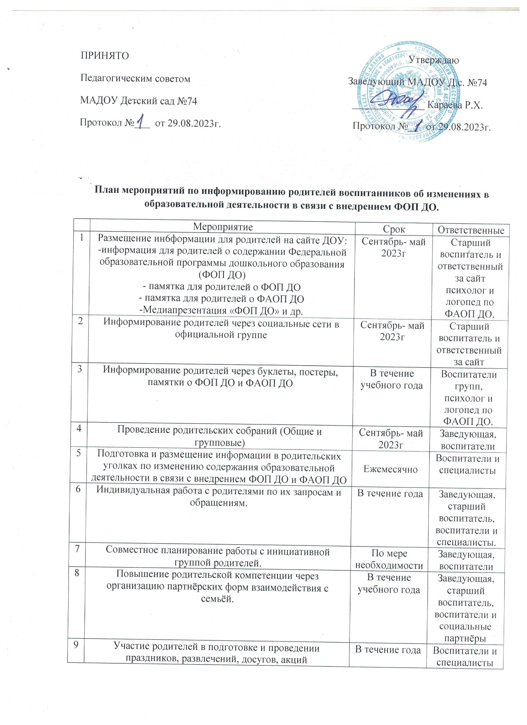 - План мероприятий по информированию родителей для подготовки к реализации ФОП ДО